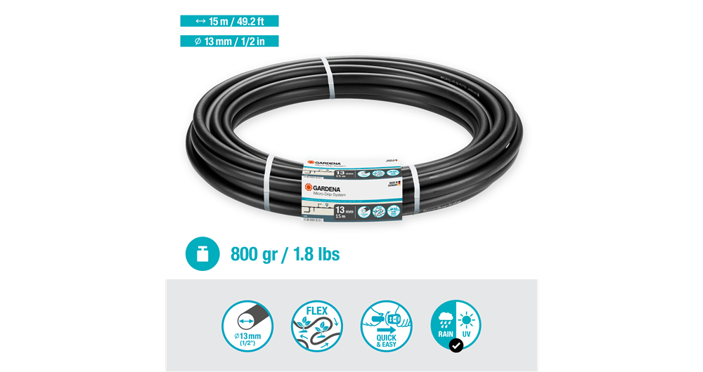Det 15 m långa Anläggningsrör Flex 13 mm (1/2") från GARDENA är en central del av ditt Micro-Drip-System. Från vattenanslutningen där systemet startar kan du leda vattnet till dina växter. Tack vare unik och flexibel teknologi kan du installera röret snabbt och enkelt. Det är också möjligt att lägga röret i en kurva, till exempel för att leda bevattningen runt ett objekt. Du kan installera röret ovan jord såväl som under mark, där den är utom synhåll. Den patenterade anslutningstekniken Quick & Easy möjliggör att du flexibelt kan bygga om eller bygga ut ditt system med Micro-Drip-komponenter. Eftersom röret är återanvändningsbart är det också hållbart. Rören tar inte skada av att användas många gånger. Bygg ut systemet med Anläggningsrör och separata Micro-Drip-komponenter som Sprinklers och Droppspridare, vilka enkelt kopplas direkt till röret. Dessutom, Anläggningsrör Flex 13 mm (1/2") har en lång produktlivslängd tack vare de högkvalitativa materialen som är UV-säkra.