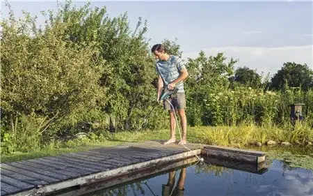 Vattenstrålens vinkel kan ställas in antingen med 15 °-munstycket eller 40 °-munstycket, dessa kan också vridas hela 360 ° i förhållande till lansen. Munstycket på 0 ° är perfekt för rengöring av trånga utrymmen. Tack vare automatiskt sug kan tryckstvätten dra vatten från ett djup på upp till 2 m via vattenförsörjningsslangen.
