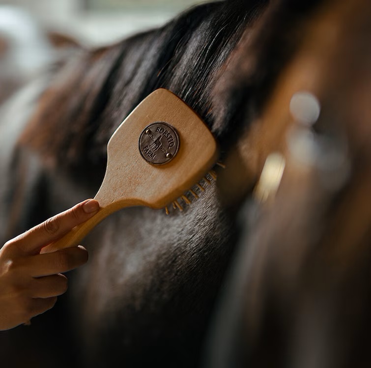 Kardformad borste för man och svans. Tillverkad av lövträ, rem av läder samt gummiplatta som inte alstrar statisk elektricitet.