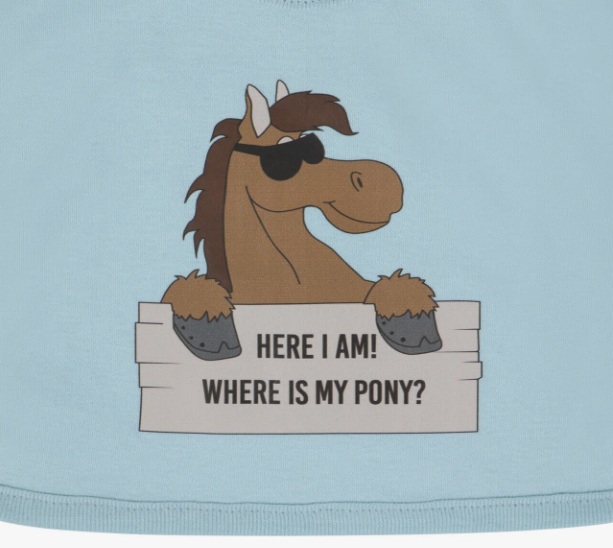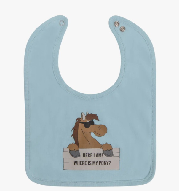 - The bib reads, 'Here I am! Where is my pony?'