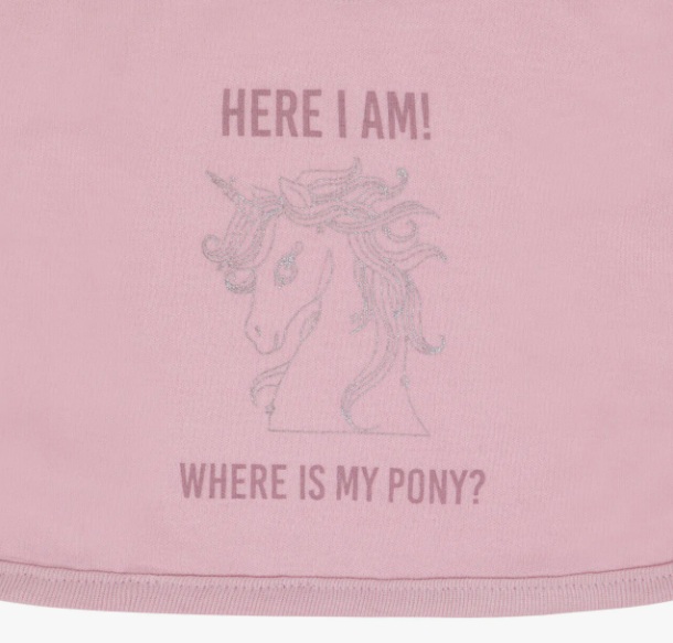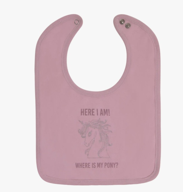 Bib matching the bodysuit Bobby. The bib has the text: 'Here I am! Where is my pony?' The bib keeps your baby's clothes dry.