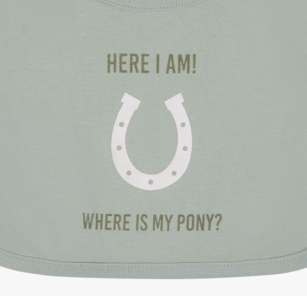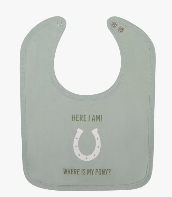 Bib matching the bodysuit Bobby. The bib has the text: 'Here I am! Where is my pony?' The bib keeps your baby's clothes dry.