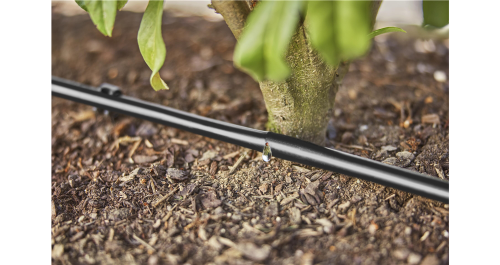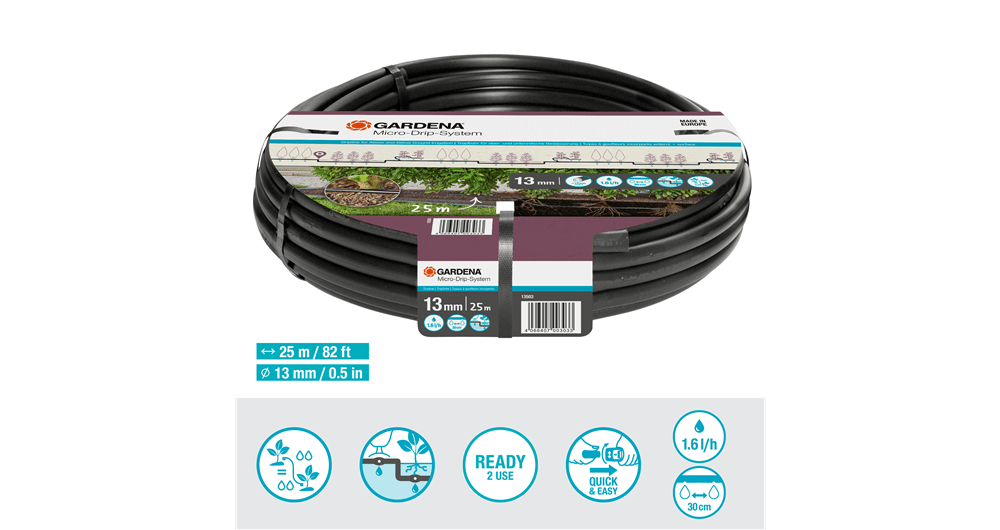 GARDENAs vattenbesparande droppslang för installation ovan- och underjord med integrerade dropphuvuden låter dig bevattna rader av växter som är upp till 25 m långa, såsom häckar och buskar. Den lättinstallerade droppslangen är det ideala tillägget för Micro-Drip startset för Häckar/Buskar (Ref.nr. 13500-20 och 13501-20). Du kan bestämma om du föredrar att installera slangen ovanför jord eller utom synhåll under marken. Tack vare den speciella självrengörande funktionen med labyrintteknik och rotbarriär kan slangen inte blockeras. Etn droppspridare är integrerat i droppslangen var 30:e cm, som ständigt släpper ut 1,6 liter vatten per timme. Detta säkerställer att dina växter bevattnas jämnt. Dropphuvudena är tryckkompenserande och klarar lätt av höjdskillnader som till exempel i en sluttning. Om du vill förgrena din linje snabbt och enkelt, använd de separat tillgängliga 13 mm-kontakterna med patenterad Quick & Easy-anslutningsteknik. Alla 13 mm komponenter i Micro-Drip-System hällbara och kan därför återanvändas. De kommer inte att skadas även efter upprepad användning