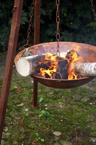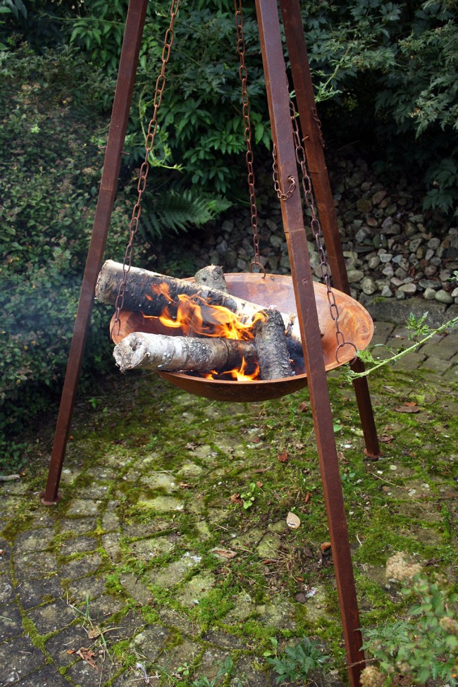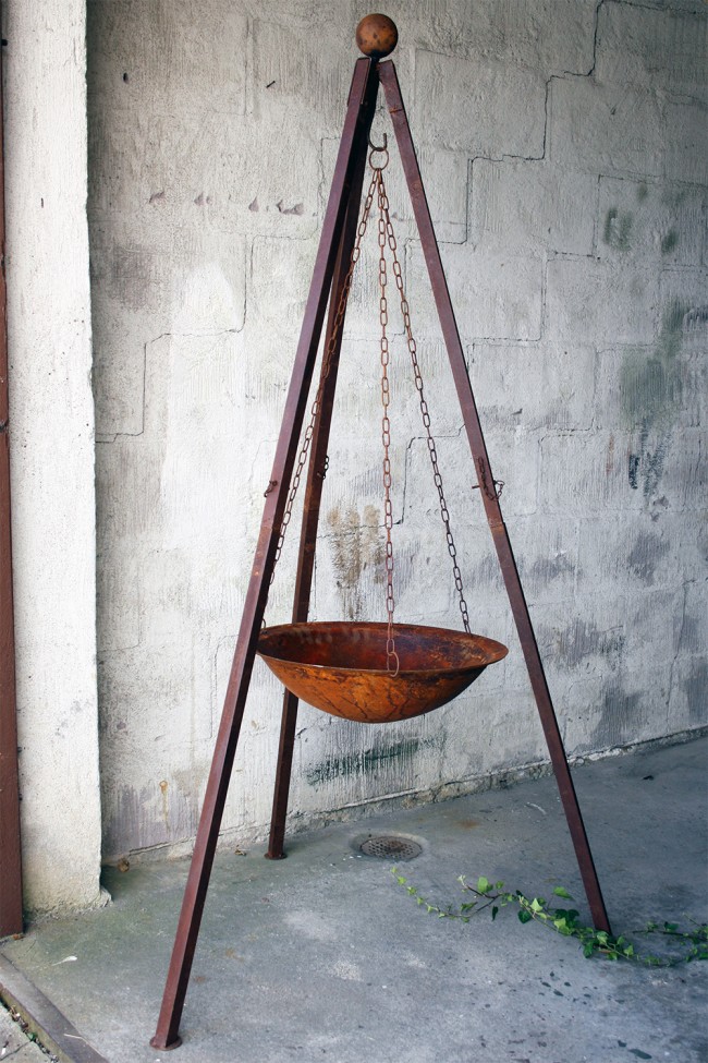 Eldskål hängande i ställning, 90x210. Rostig metall