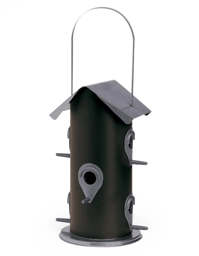Stor fågelmatare för fågelfrö. Tak och botten i grå, behållare i svart metall. 6 foderuttag med sittpinne i grå plastöverdragen metall. Fylls på uppifrån. Rymmer ca 3 liter. H 32cm Ø 16cm.