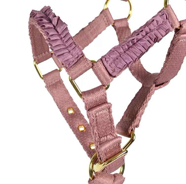 Mjuk fölgrimma, justerbar runt nos och nacke. Dekorativa volangdetaljer, guldfärgade beslag och avtagbar praktisk rem undertill.