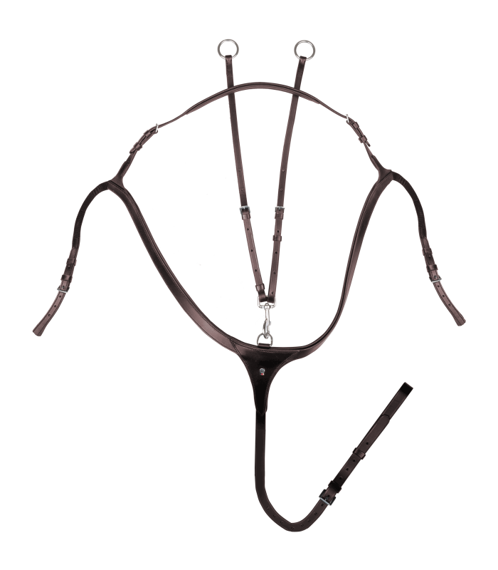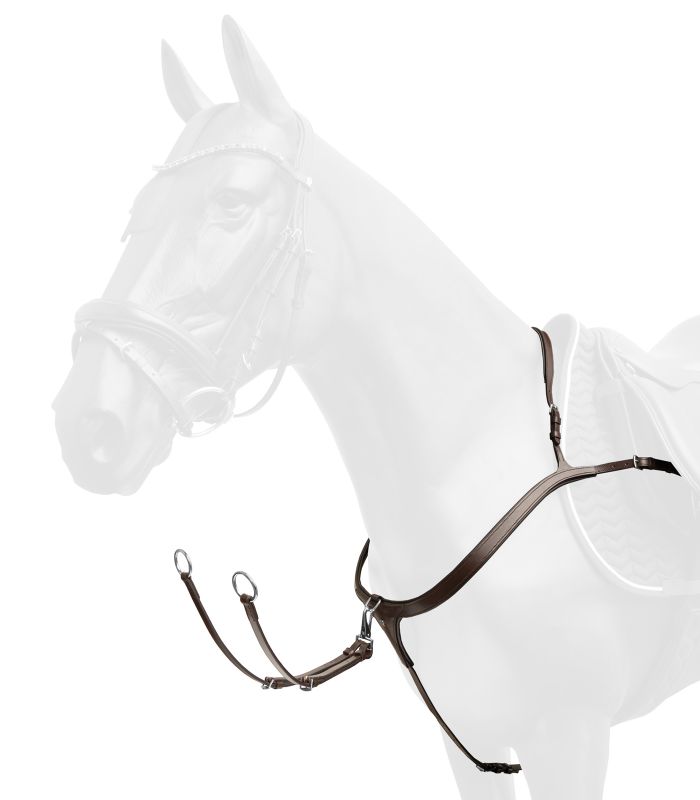 High-quality breastplate with anatomical cut – optimum stability and freedom of movement. The Waldhausen X-Line breastplate with long bridge and deep 3-point prevents the saddle from slipping without disturbing the horse. The anatomical cut allows unrestricted freedom of movement of the shoulder and at the same time provides optimum support for the saddle. It is attached at three points: On the saddle girth with an adjustable leather strap and on the girth straps. The breastplate combines stability and comfort for the horse and supports optimum performance during training.