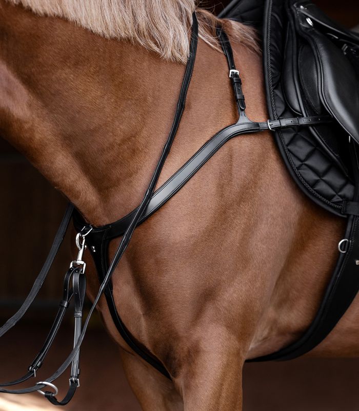 High-quality breastplate with anatomical cut – optimum stability and freedom of movement. The Waldhausen X-Line breastplate with long bridge and deep 3-point prevents the saddle from slipping without disturbing the horse. The anatomical cut allows unrestricted freedom of movement of the shoulder and at the same time provides optimum support for the saddle. It is attached at three points: On the saddle girth with an adjustable leather strap and on the girth straps. The breastplate combines stability and comfort for the horse and supports optimum performance during training.