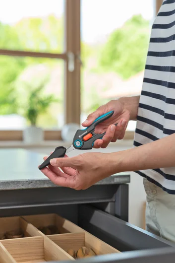 FreshCut från GARDENA är särskilt lämplig för skörd av färska örter, bär eller snittblommor. De smala, spetsiga precisionsbladen av rostfritt stål kommer att imponera på dig vid varje klipp. Med hjälp av FreshCut kommer du att lyckas göra rena och exakta snitt ända till skärbladens spets. Skördesaxen är smidig att användas i täta plantor så att du enkelt kan skörda basilika eller blommor. Saxen ligger bekvämt och säkert i handen tack vare de halkfria ErgoTec-handtagen med mjukt grepp. För säker förvaring och transport, sätt det medföljande säkerhetslocket över de stängda bladen. Med enhandslåsmekanismen kan du helt enkelt låsa och låsa upp saxen. Oavsett vad du skördar eller beskär, avger de livsmedelsgodkända bladen ingen smak eller lukt. För enkel rengöring kan saxen diskas i diskmaskin.