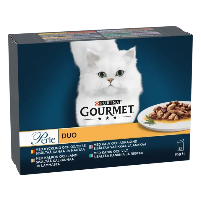 Även de mest kräsna katterna frestas av GOURMET® Perle minifiléer från Purina. Nu finns ett urval med fyra måltider, var och en med en utsökt kött som erbjuder din katt en variationsrik och läcker rätt. Fina välsmakande bitar kombineras med en mustig sås för den ultimata matupplevelsen. Alla våra foder är kompletta och balanserade och säkrar att din katt får allt den behöver för ett hälsosamt liv. Sortimentet omfattar välsmakande kombinationer av kyckling och ox, kalkon och lamm, anka och kalv samt kanin och vilt som alla är lika frestande. Varje måltid packas i en försluten portionspåse på 85 g för fräschör, vilket garanterar utsökt smak – varje gång. Det blir dubbelt så svårt att motstå för din katt!