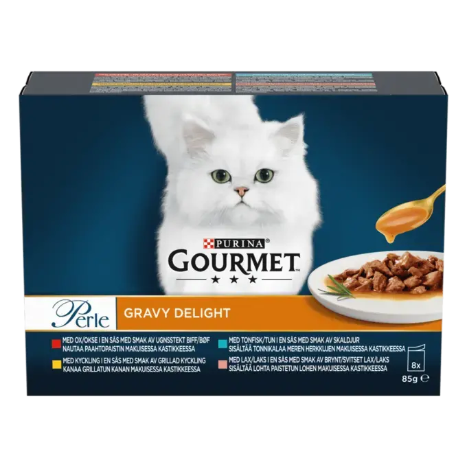 Skäm bort din katt med våra läckra GOURMET®Perle minifiléer Gravy Delight från Purina. Den här förpackningen med välsmakande våt kattmat ingår i vår unika Connoisseurs Collection, som med sitt urval av måltider med kyckling, ox, lax och tonfisk garanterar att din katt hittar en smak att älska. Våra Gravy delight recept är baserade på en len och smakrik sås som sedan kombineras med fina och möra bitar av kyckling, ox eller fisk® GOURMET® Perle minifiléer Gravy Delight är ett 100 % näringsmässigt komplett och balanserat foder. Våra näringsexperter har utvecklat våra oemotståndliga recept med hänsyn till din katts smaklökar för en glad och nöjd katt – varje gång.