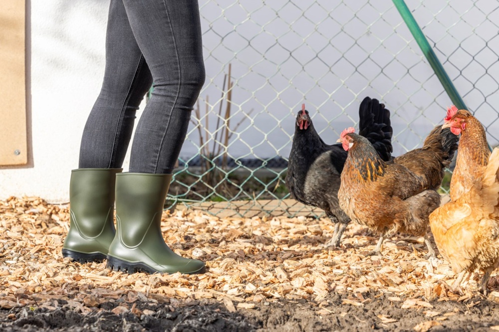 - Short-shaft work boots with robust polyvinyl chloride (PVC) upper material, REACH-compliant and phthalate-free