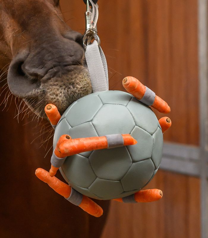 The top nylon loop is used to make it easy to hang up in the stable or outdoors. Carrots, and also other snacks such as pieces of apple, treats or hay, can be put through the rubber loops attached.
