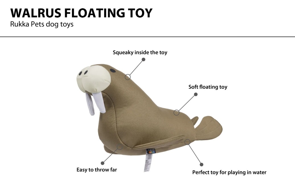 A funny fellow, the floating walrus toy for dogs' water games. It features a squeaker and stands out well against the water. The toy is lightweight and soft, making it easy to throw a longer distance. This toy is intended for larger dogs.