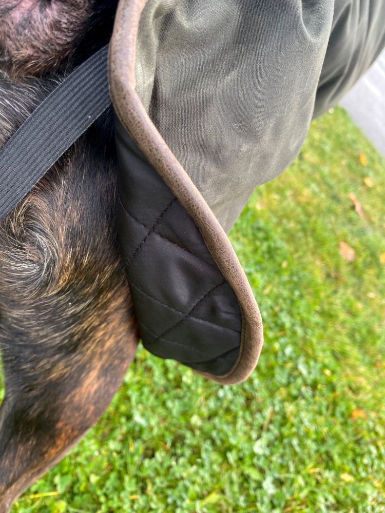 Hundtäcke i vaxat yttermaterial med kantband och fina detaljer. Tunnare innerliner som ger viss värme. Perfekt som övergångstäcke för mindre hundar eller regntäcke för större hund med mycket päls.