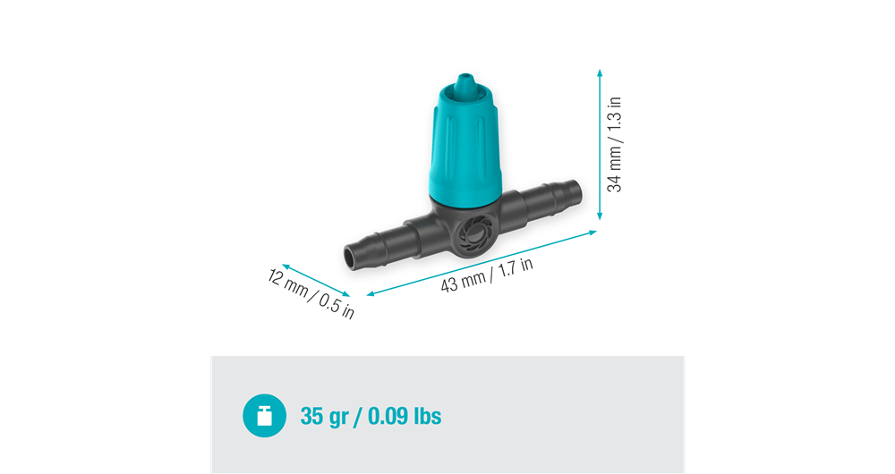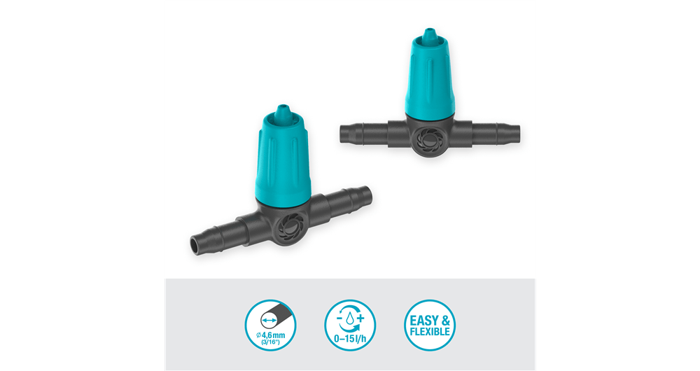Använd den justerbara Inline droppspridaren 0-15 l/h från GARDENA för riktad och vattenbesparande bevattning. Det kan användas tillsammans med 4,6 mm matningsröret för att optimalt vattna rader av krukväxter och rabattväxter med olika vattenbehov. Beroende på den enskilda växtens vattenbehov kan du ställa in vattenflödet individuellt mellan 0 och 15 liter per timme. Därför är Inline Drip Head perfekt lämpad för olika eller ökande vattenbehov i växtraden. Tack vare den enkla och flexibla anslutningstekniken är installationen av Inline Droppspridaren intuitiv. Det är bara att ansluta Micro-Drip-komponenten till matningsröret, koppla bort den lika enkelt och sätta tillbaka den för flexibel användning på annat håll. I det avtagbara spruthuvudet upptäcker du rengöringsnålen, som du kan använda för att rensa dropphuvudet.