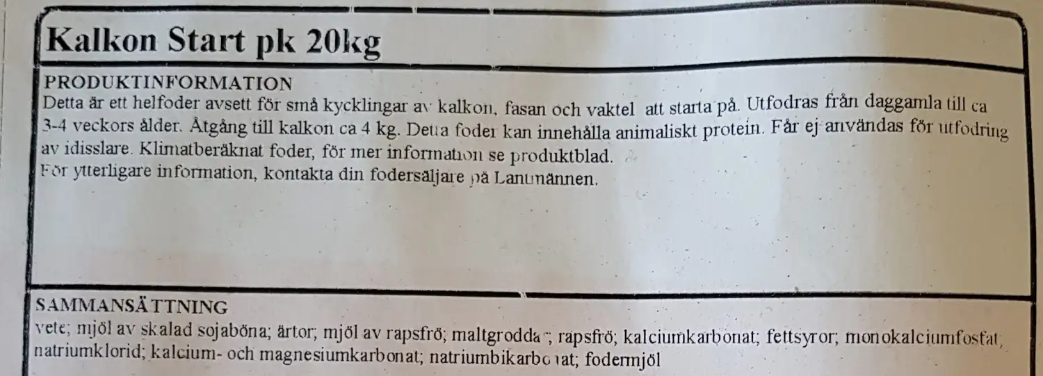 Ett helfoder från Lantmännen avsett för små kycklingar av kalkon, fasan och vaktel att starta på. Utfodras från daggamla till ca 3-4 veckors ålder och ges i fri åtgång.