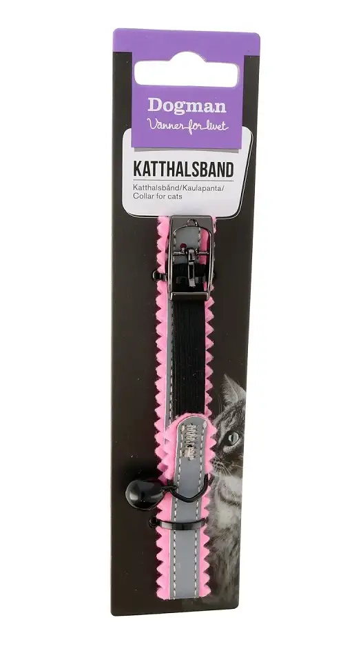 Bandet är reflekterande och har en stretch-del så att katten kan ta sig loss om den fastnar i halsbandet.