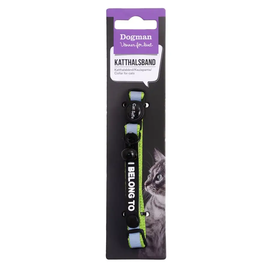 Katthalsband med reflekterande rand, "I belong to" samt snabblås.