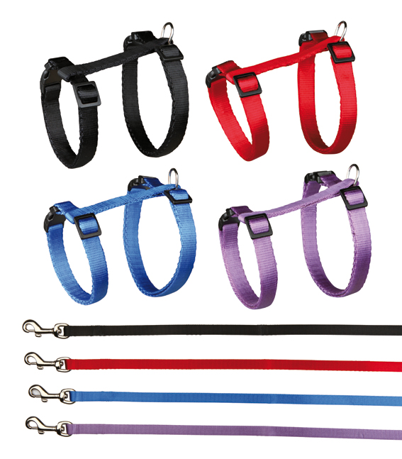 Kattsele & koppel med snabblås, ställbart. Nylon. Blandade färger, 26-43cm