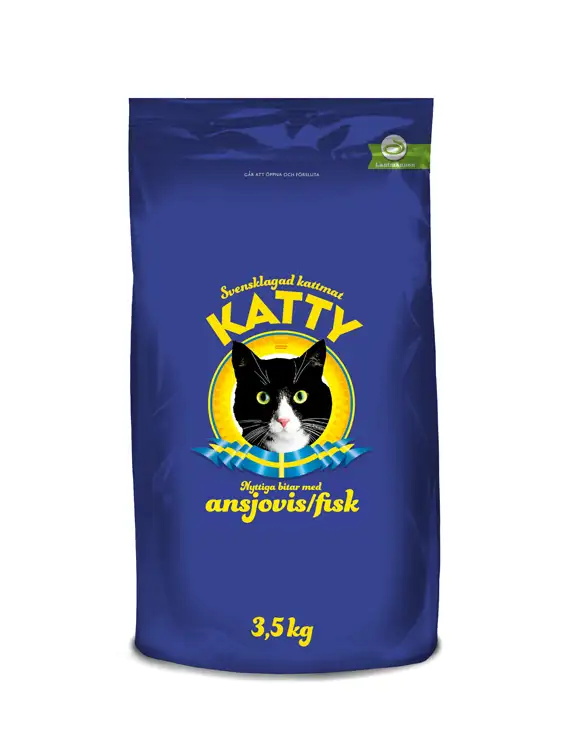 Helfoder för katter, med ansjovis-smak. Serveras torrt tillsammans med en skål friskt vatten.