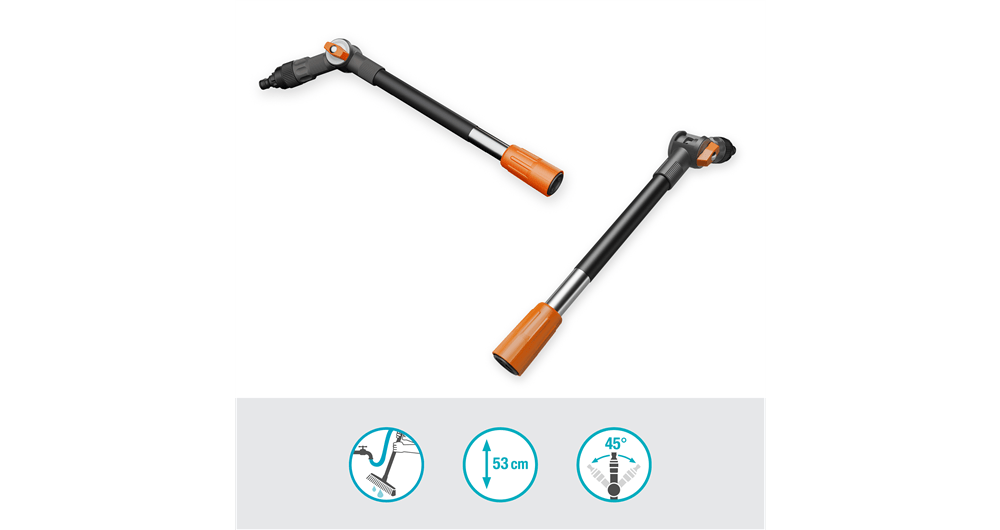 Skaftet går att vinkla 45° på båda sidor och möjliggör en smidig rengöring av ytor på högre höjd som t.ex. taket på en vinterträdgård eller en husbil. Skaftet kan användas som förlängning i kombination med ett annat Cleansystem-skaft och klickas enkelt ihop med trädgårdsslangen.