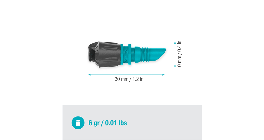 Använd Micro Sprinkler 180° från GARDENAs Micro-Drip-System för 180° bevattning av dina blomster- eller grönsaksbäddar med fin dimma. Komponenten har en kastlängd på 2.75 m, och bevattnar en yta om ca 14 m². Installationen är enkel, oavsett om du använder GARDENA Monteringsverktyg för att göra ett hål i det 13 mm tjocka anslutningsröret eller monterar munstycket i en T-koppling för Micro Sprinkler. Du kan montera Micro Sprinkler högre genom att använda separat tillgängliga Förlängningsrör för spridarmunstycken (Ref.nr. 13326-20). På så vis kan även högre plantor vattnas ovanifrån. Om du vill reglera vattenflödet eller stänga av individuella delar av anslutningsröret kan Reglerventil 13 mm (1/2") (Ref.nr. 13207-20) användas. Med denna säkerställs också optimal, vattenbesparande bevattning. Tack vare den intuitiva designen kan bevattningsmönstret ses direkt på sprinklerhuvudet. Detta särskiljer tydligt alla GARDENA Micro Sprinkler från varandra.