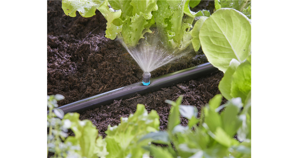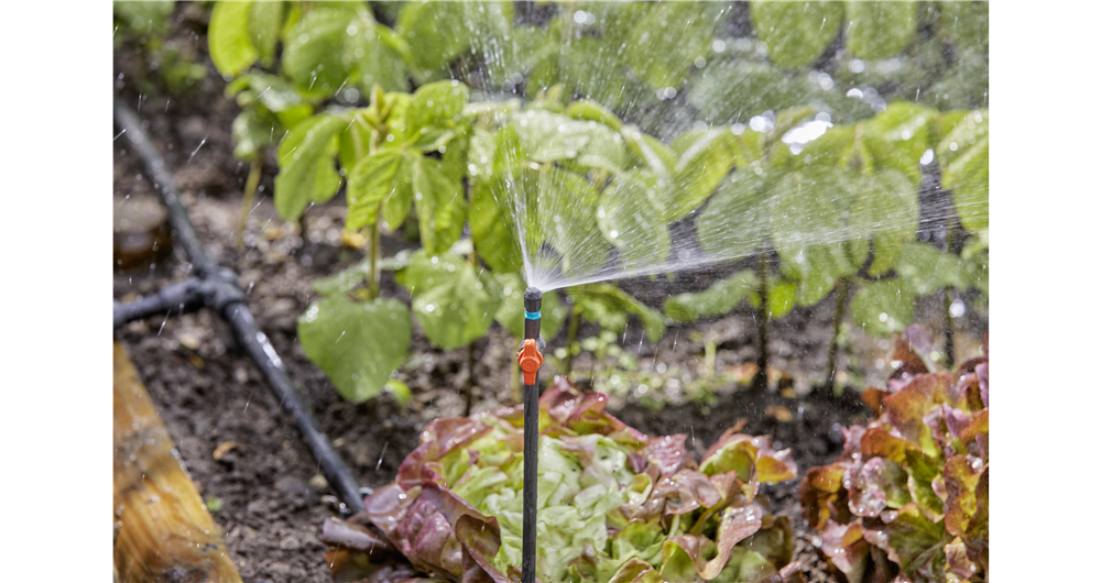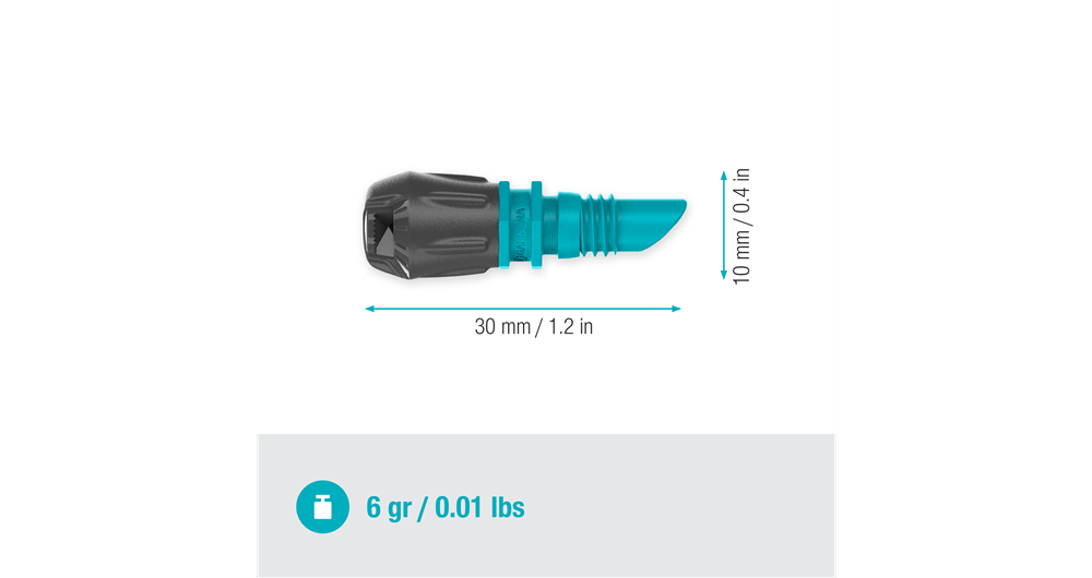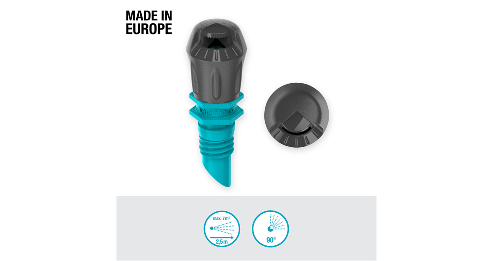 Med Micro Sprinkler 90° från GARDENA kan du vattna plantor på ett tillförlitligt sätt även i hörn och kanter av rabatten. Micro-Drip-komponenten ger dina grönsaks- och blomsterbäddar en fin sprutdimma över ett område på 90° - idealiskt från bäddens hörn. Den når en räckvidd på 2,75 m och bevattnar en total yta på 7 m². Installationen av munstycket på ett 13 mm anslutningsrör sker snabbt och enkelt med hjälp av monteringsverktyget eller genom att använda T-kopplingen för sprutmunstycken. Med förlängningsröret för sprutmunstycken (Ref.nr. 13326-20) kan du höja Micro Sprinklerns position för att bevattna högre växter uppifrån. Om du vill reglera bevattningen eller helt stänga av enskilda strängar i anslutningsröret är avstängningsventilen (Ref.nr. 13207-20) rätt tillbehör för dig. Resultatet blir optimal och vattenbesparande bevattning. Tack vare den intuitiva designen kan man se sprutmönstret direkt på spruthuvudet, vilket tydligt skiljer alla GARDENA-sprutmunstycken från varandra.