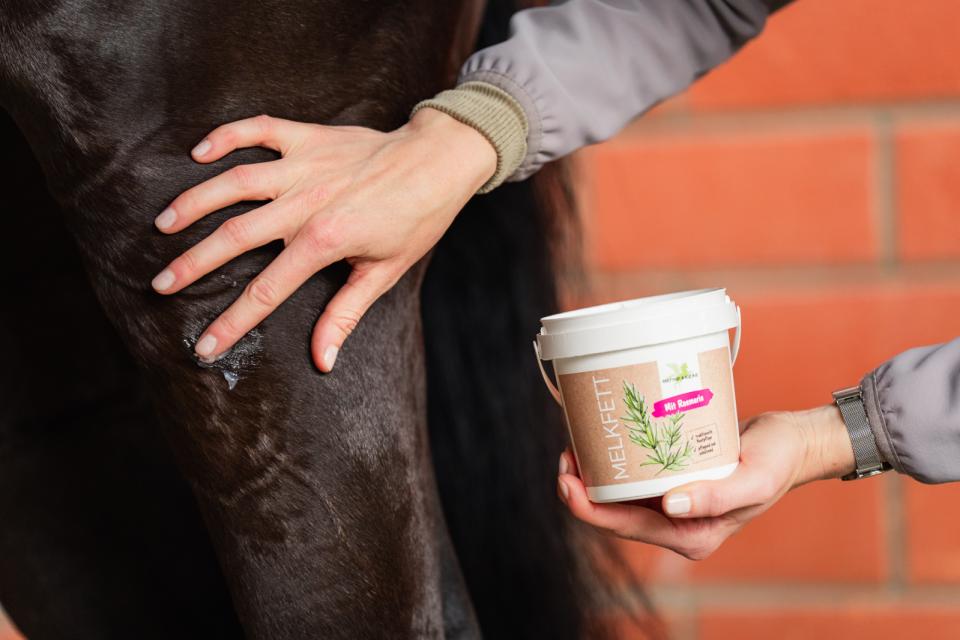 Hudvård av råmjölk – också på hästens känsliga områden som juver, mundviga och ögon.