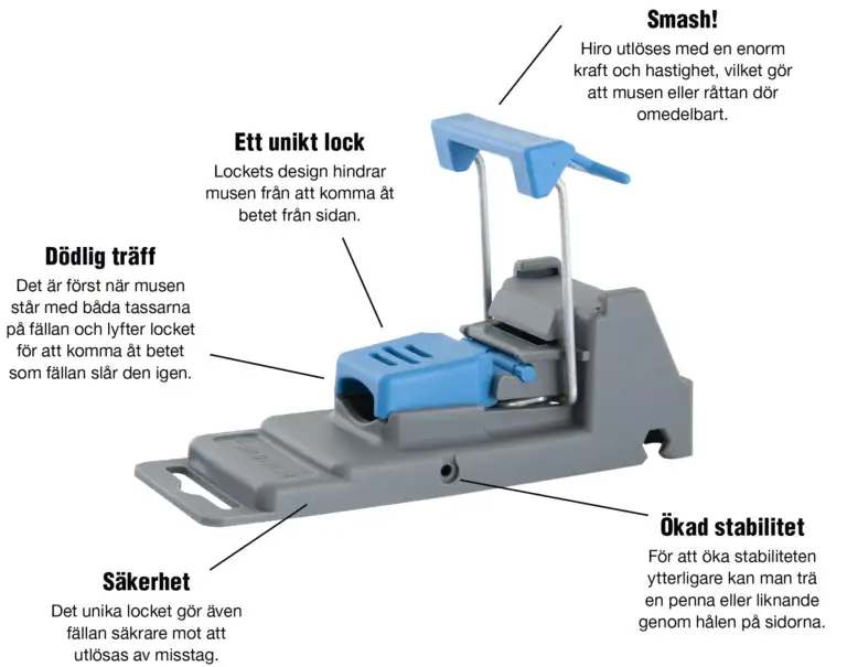 Hiro är en helt ny fälla som grundar sig på en världspatenterad och välbeprövad teknik. Doften från betet, som fällan betats med, sprids med hjälp av fällans unika lock. Fällan löser ut först när musen står med båda frambenen framför betet och lyfter locket. Hiro utlöses med en enorm kraft och hastighet, vilket gör att musen eller råttan dör omedelbart. Kraften, hastigheten och stabiliteten i plattan gör Hiro till en väldigt trygg och säker fälla.