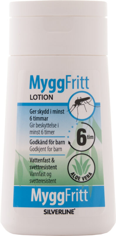 Mygglotion från Silverline som är baserad på växtbaserad citroneukalyptusolja. Medlet appliceras och smörjs enkelt in på huden. Innehåller Aloe Vera som är mjukgörande och verkar läkande på huden. Kan användas på barn från 1 års ålder. Ger skydd i minst 6 tim mot mygg, knot och bitande flugor. 100 ml.