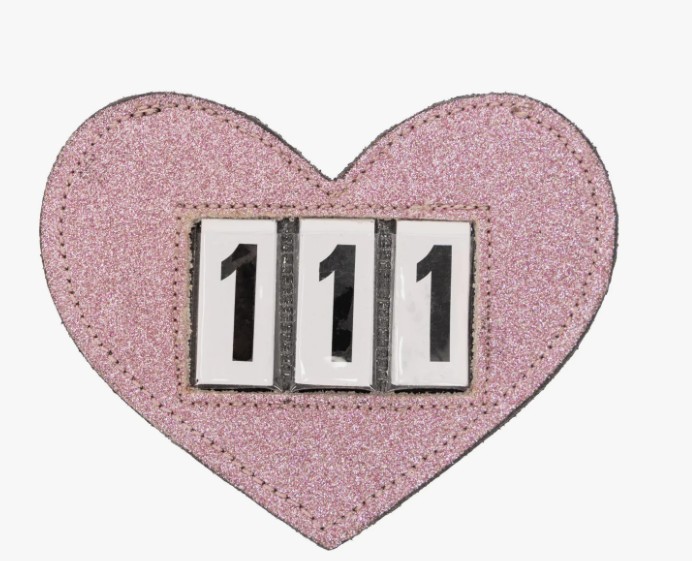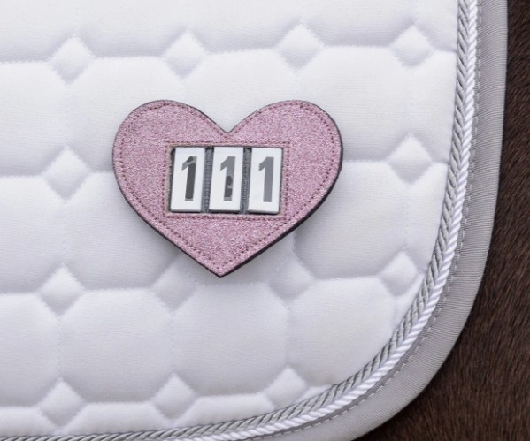 The number holder in the shape of a heart is finished with subtle glitter. This number holder can be easily attached to the bridle or saddle pad using safety pins or hook-and-loop fastener. The interchangeable numbers are included.