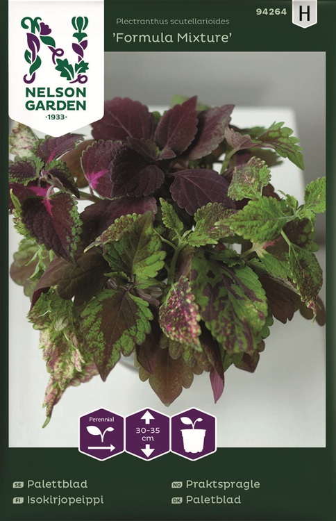Denna mix ger plantor med extra stora blad och en mängd färgvariationer. En solig placering ger bladen en mer intensiv färg. Dekorativ krukväxt. Toppa regelbundet så blir plantan buskig.