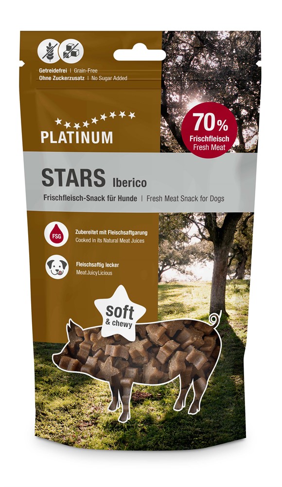 Våra STARS Iberico är mjuka godbitar med färskt kött – perfekta som belöning eller träningssnacks. Tillverkade av färskt Iberico-kött och förädlade med vår unika FSG-teknik är dessa snacks oemotståndligt goda och skonsamma för magen. Iberiskt fläskkött (Iberico) är en ovanlig proteinkälla och ett utmärkt val för näringskänsliga hundar tack vare sin höga smältbarhet.