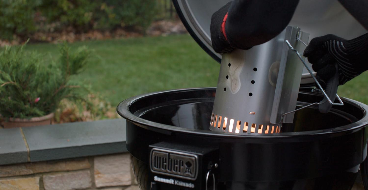 Tänd skorstenständaren med hjälp av Webers tändkuber. Lägg ett par kuber under skorstenständaren och tänd med en tändsticka, så sköter briketterna sig själva tills de är rödglödande och redo att hällas i grillen.