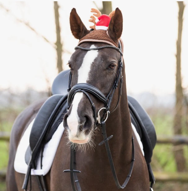 Ear net for the most fun time of the year! The ear net has a Christmas hat and reindeer antlers. Your horse or pony's ears can easily fit through the holes. You can attach the strings around the horse's throat.