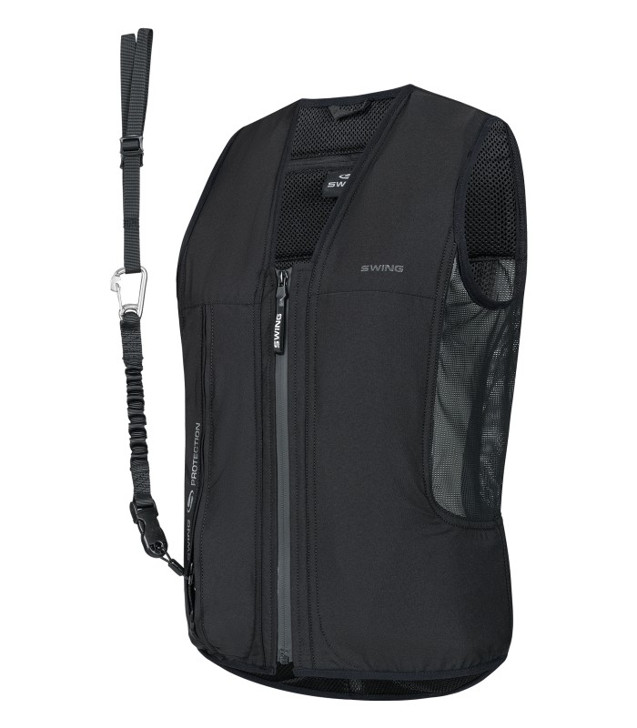 The new SWING P25 AIR airbag vest sets new standards in equestrian sports and offers an innovative protection mechanism that reacts in seconds when it counts. Tested in accordance with the latest NF S72-800:2022, it fulfils the highest requirements for airbag systems in equestrian sports - for added safety with maximum freedom of movement. The P25 AIR has been specially developed for use in equestrian sports and adapts perfectly to the body thanks to its ergonomic design and lightweight, breathable material. Integrated stretch zones and a close-fitting style allow unrestricted freedom of movement. From off-road to jumping or in training. The airbag system protects particularly vulnerable areas of the body such as the neck, chest, back, coccyx and pelvis. It inflates in milliseconds as soon as the integrated trigger mechanism is activated. The vest is released mechanically via a ripcord that is securely attached to the saddle. In everyday use, the P25 AIR is impressively lightweight and has a discreet appearance. The SWING P25 AIR airbag vest is easy to reactivate: after deployment, the CO2 cartridge can be replaced automatically so that the vest is quickly ready for use again. With its practical front zip and clean lines, it fits seamlessly into the high-quality SWING product range. For riders who make no compromises - the P25 AIR combines state-of-the-art protection technology with sporty elegance.