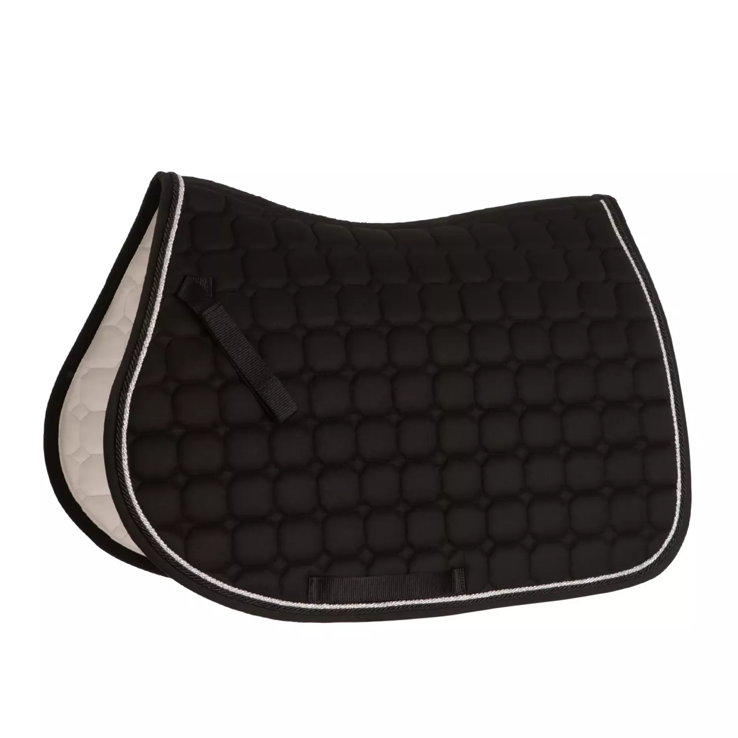 Stilrent schabrak med tålig utsida i bomullsmix/polycotton. Rejäl filt inuti ger schabraket god stadga och bra passform. Insidan är i mjuk bambu Certifierad enligt OEKO-TEX® Standard 100, Klass 1, vilket ger en naturligt fukttransporterande och behaglig för hästen. Fin smårutig Octagon quilt och Protector brodyr längs ryggen. En snygg och skimrande Zari-passpoal med olika färgkombinationer. Sadelstrap med kardborre. Schabraket lämpar sig väl för att brodera på.