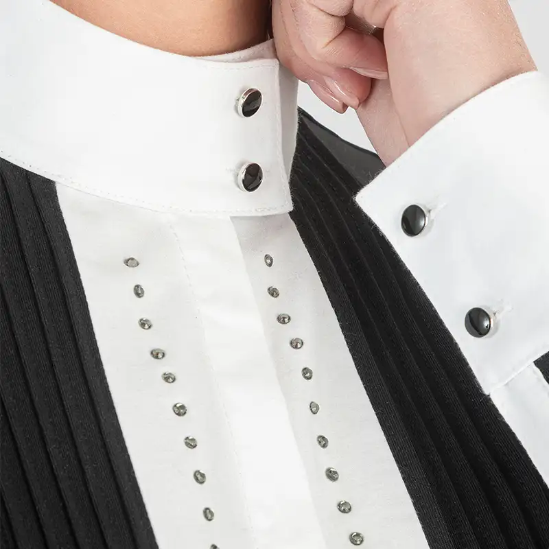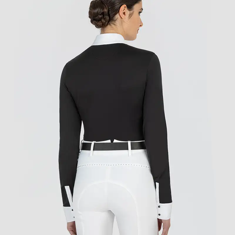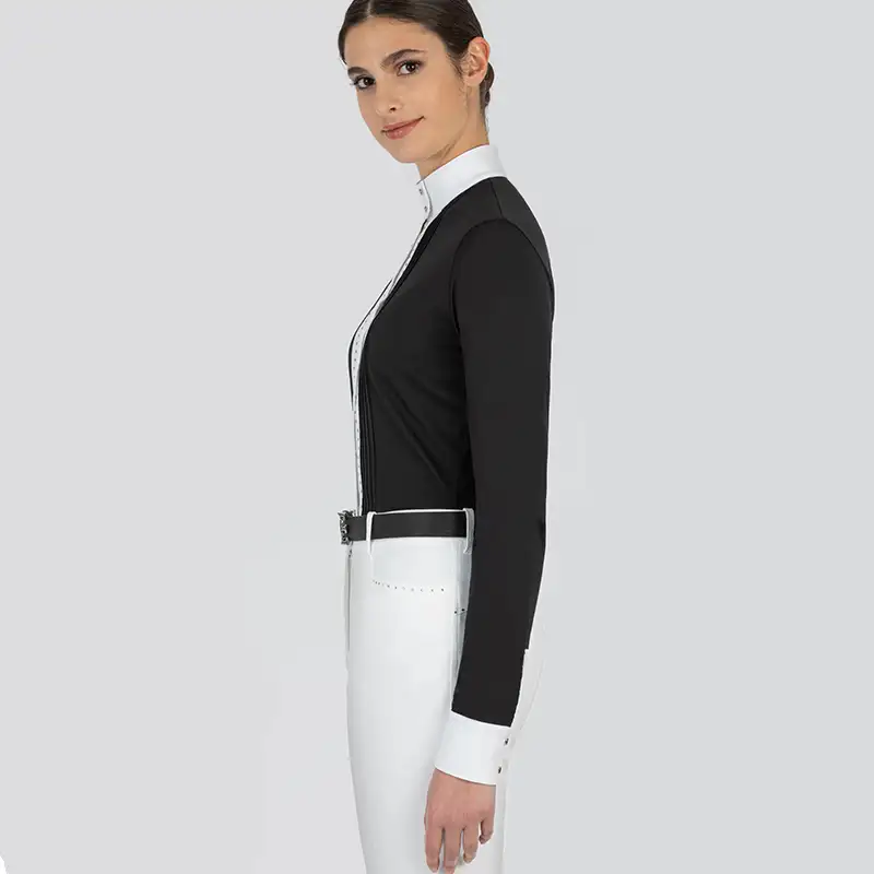 Gerdag långärmad damskjorta från Equiline Mycket elegant och bekväm tävlingsskjorta i ett tunt och fint material. Snygga detaljer med skimrande kristaller och vackra stenar som knappar på kragen och manchetten. Mycket stretchig med hög andas-funktion.