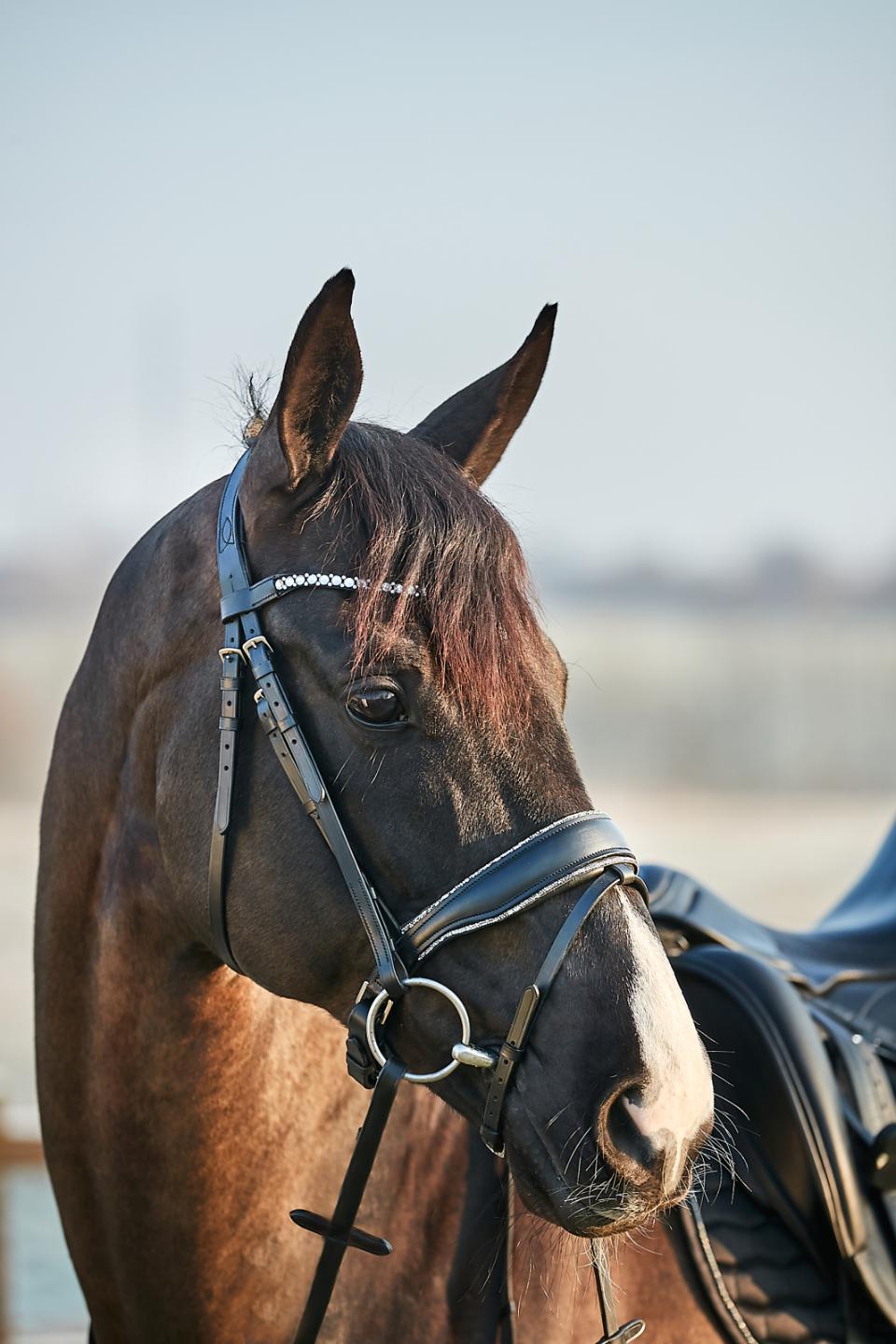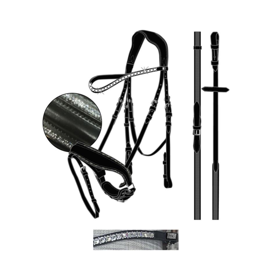 Tygel i platt läder med vadderat nosgrimma och standard blixtfäste. Nosgrimman är fodrad med två kompletterande rader av vackra, fina diamanter. Anatomiskt format och vadderat huvudstycke för att ge maximal komfort och optimal passform. Böjt pannband dekorerat med brokiga diamantstenar. Levereras med 16 mm supergrip tyglar.