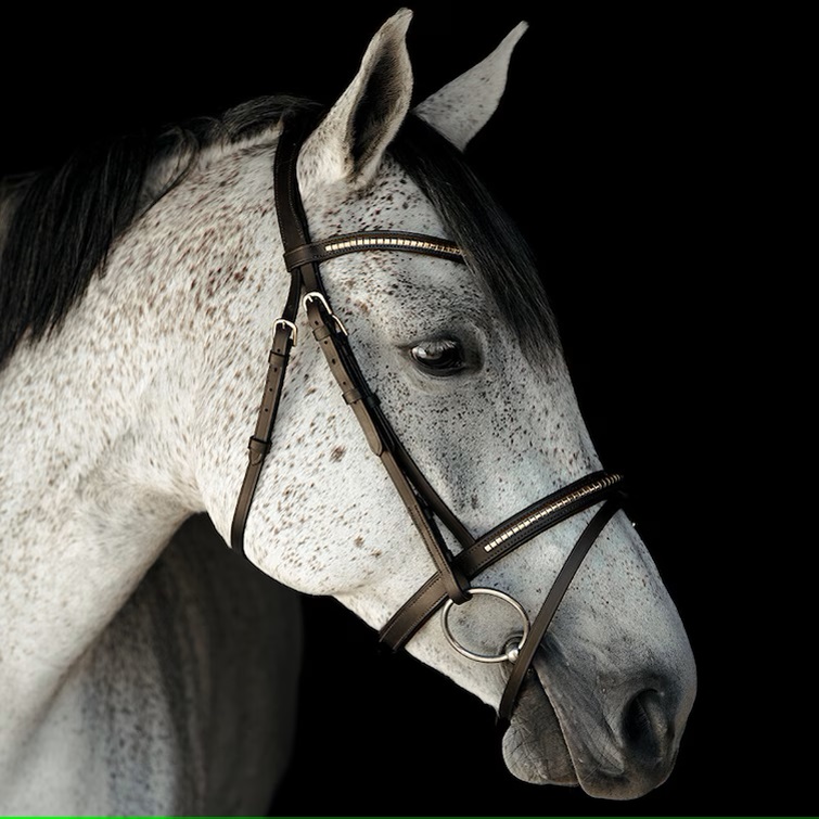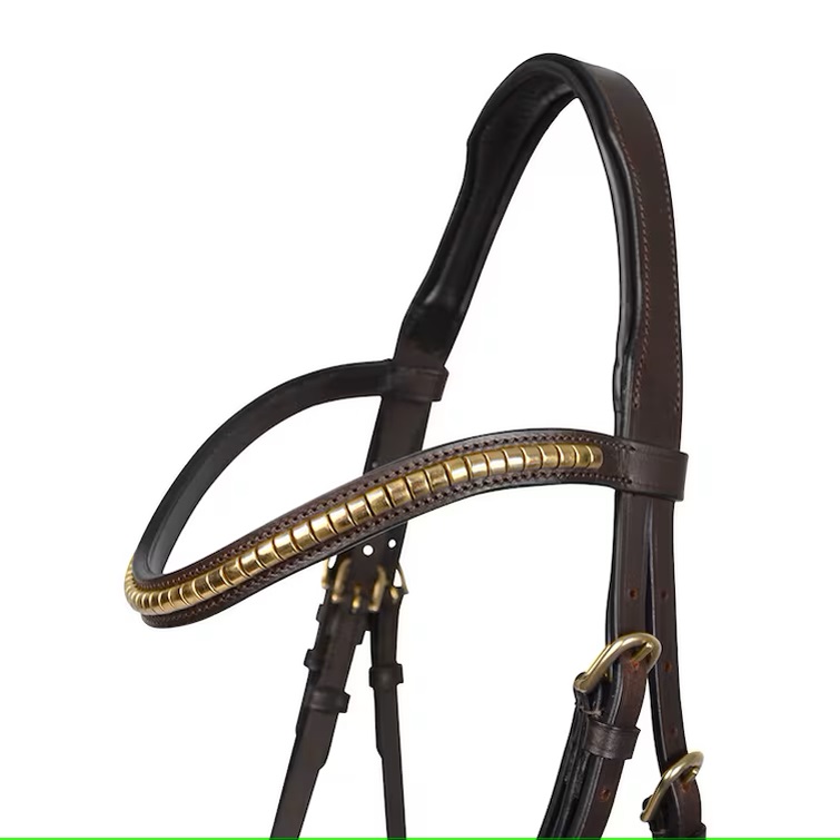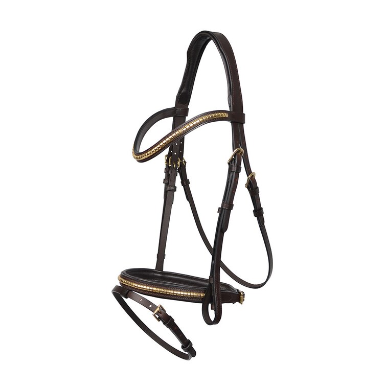 Tidlöst clincher-träns med ergonomiskt utformat nackstycke och aachennosgrimma. Tillverkat av högkvalitativt mjukt läder. Fodrad nosgrimma och nackstycke, dekorerade med mässingsfärgad clincher. Spännen i mässing. Säljes utan tyglar.