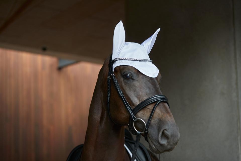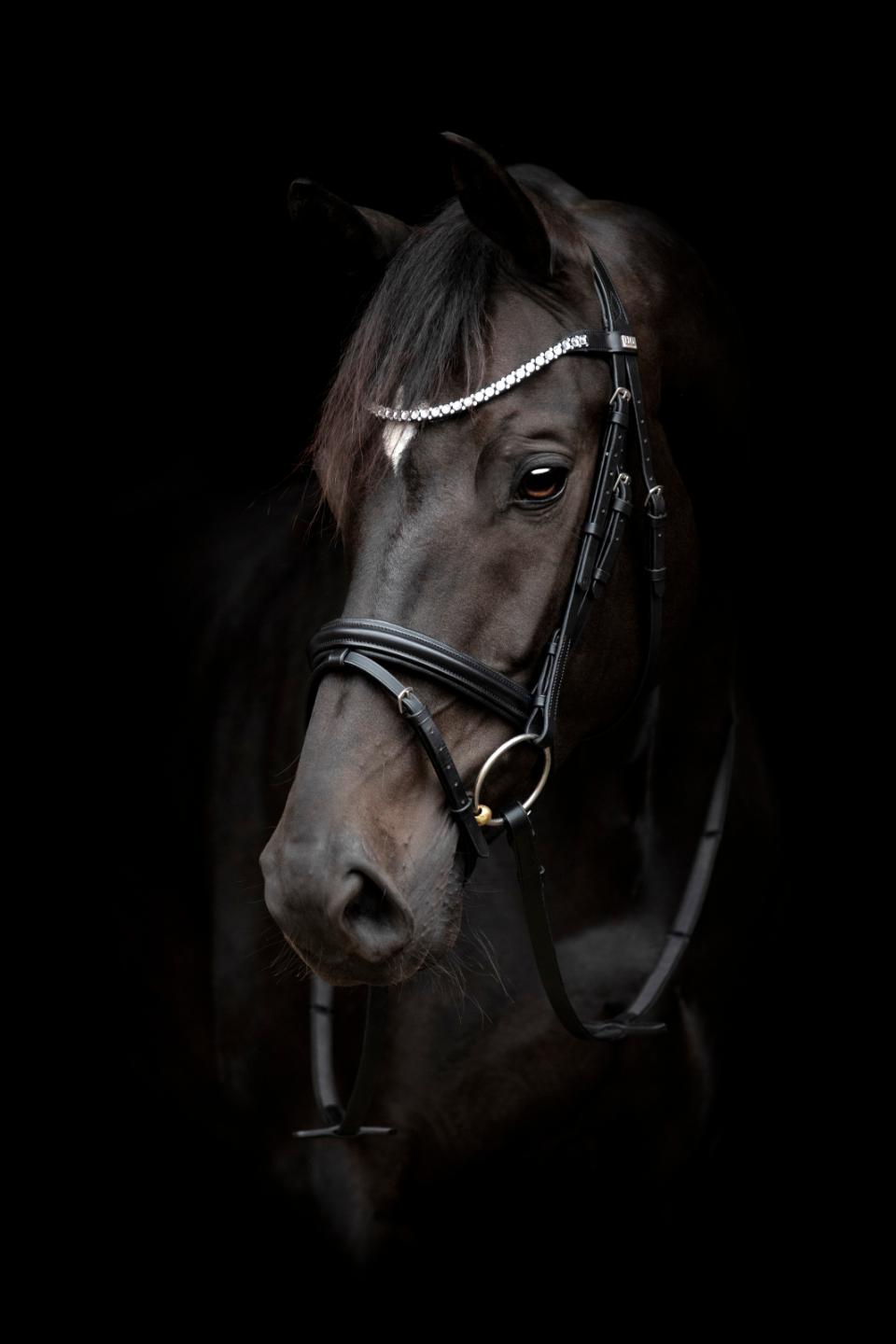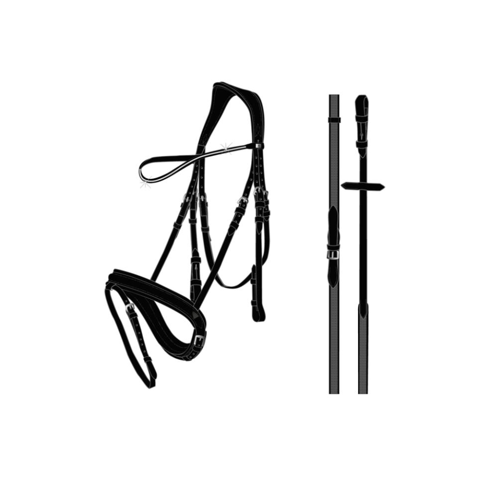 Premium bridle handmade from a soft and supple leather. Perfect for all types of everyday training. Classic flat leather edged with decorative leather channelling. Superior design provides the optimal fit for the horse. Ergonomically shaped head piece provides maximum comfort around the ears. Thickly padded head piece and nose band alleviate poll pressure and prevent compression of the sensitive facial nerves surrounding the cheek bones and upper jaw. Nose band equipped with a simple flash attachment. Double-sided throat latch closure ensures the buckles lie symmetrically. Curved brow band, accented with variegated white crystals, elevate this overall classic bridle style, giving it that wow factor perfect for competition. Nickle polish fittings compliment the flashy nose band. Supplied with 16mm super-grip reins.