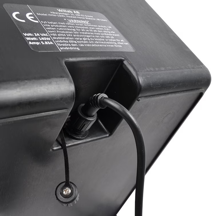 Värmebalja som kan användas utomhus eller i ouppvärmda utrymmen under den kalla årstiden. Tillverkad i livsmedelsgodkänd plast som är kraftig och isolerande. Baljan klarar ner till – 20 grader i stilla förhållanden. Inbyggd termostat som startar när den omgivande temperaturen är ca 3 grader. Rymmer 60 liter med 5-litersskala och står stabilt på en bred botten. Vattentät transformator, IP68, och sladd (total längd 10 m varav 5 m kontakt-transformator) ingår.