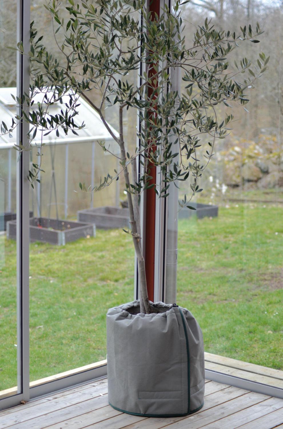 Isolerande vinterskydd för växter i kruka på t.ex. balkong. Med kardborrband och dragsko. Tre skyddande lager av polypropen (PP) 100 g/m² resp. 30 g/m² samt polyeten (PE). Botten av 4 cm frigolit. Höjd 50 cm, Ø45 cm.
